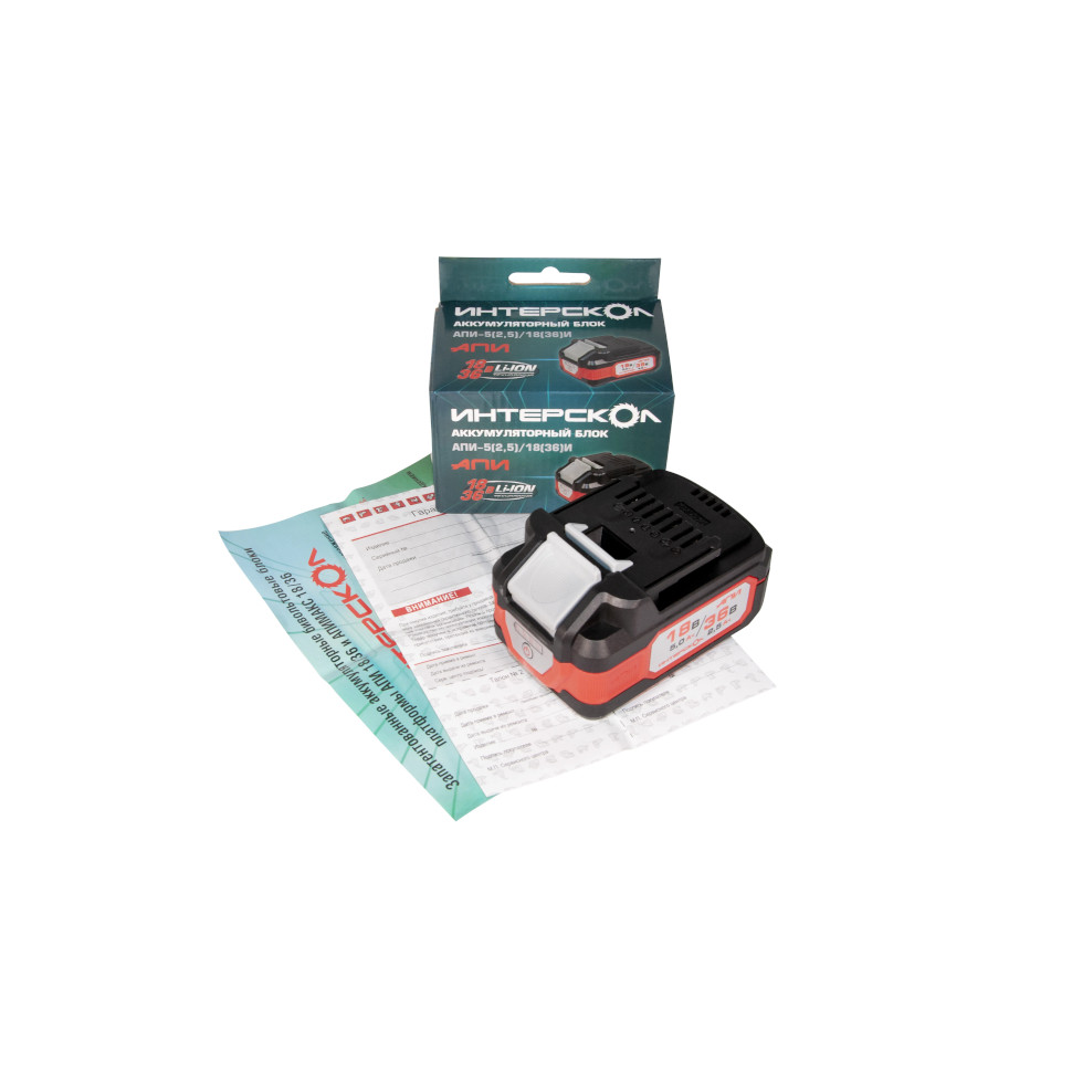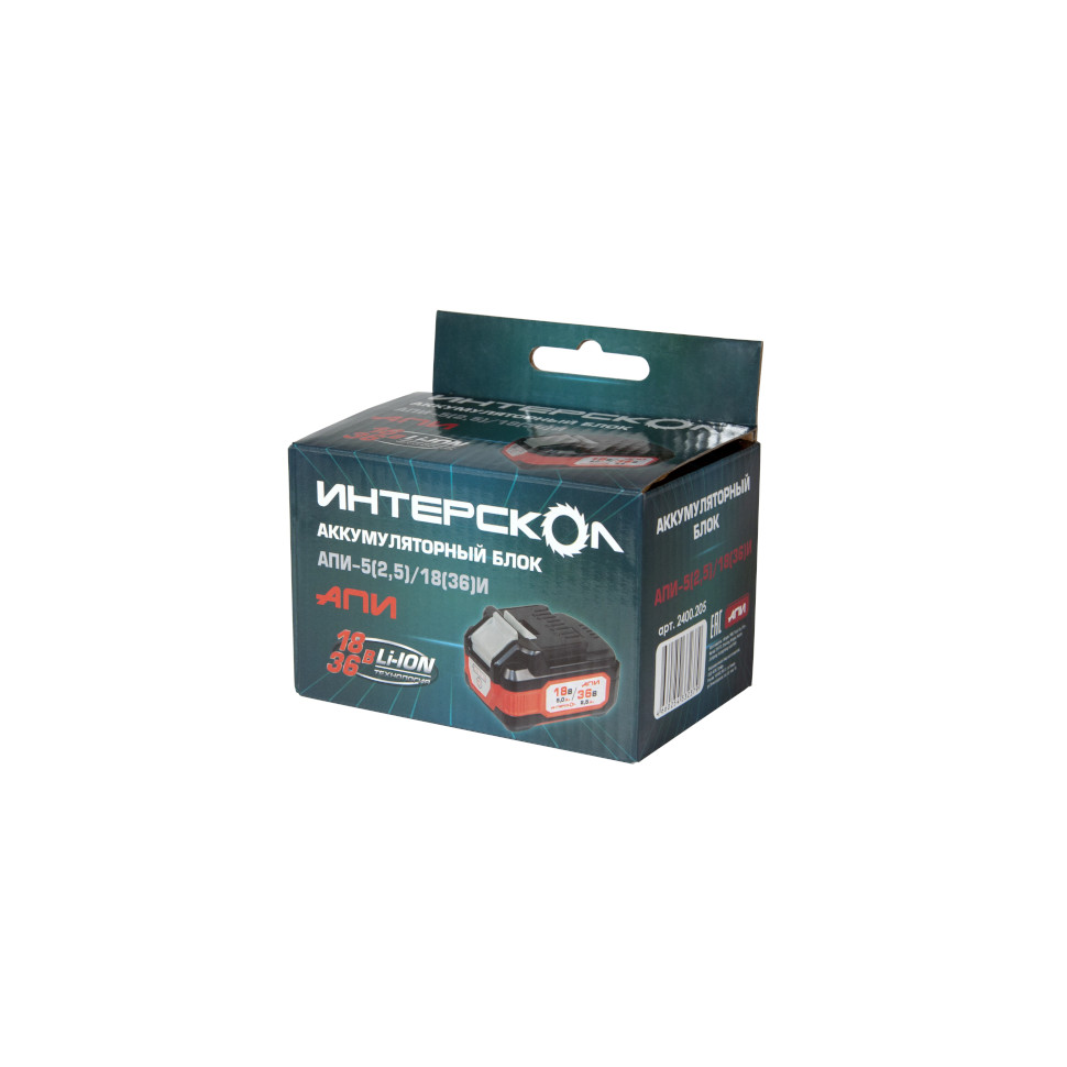 Характеристики Аккумулятор ИНТЕРСКОЛ АПИ-5(2,5)/18(36)И, 18В-5Ач, 36В-2.5Ач, Li-lon, с индикацией заряда (2400.205)