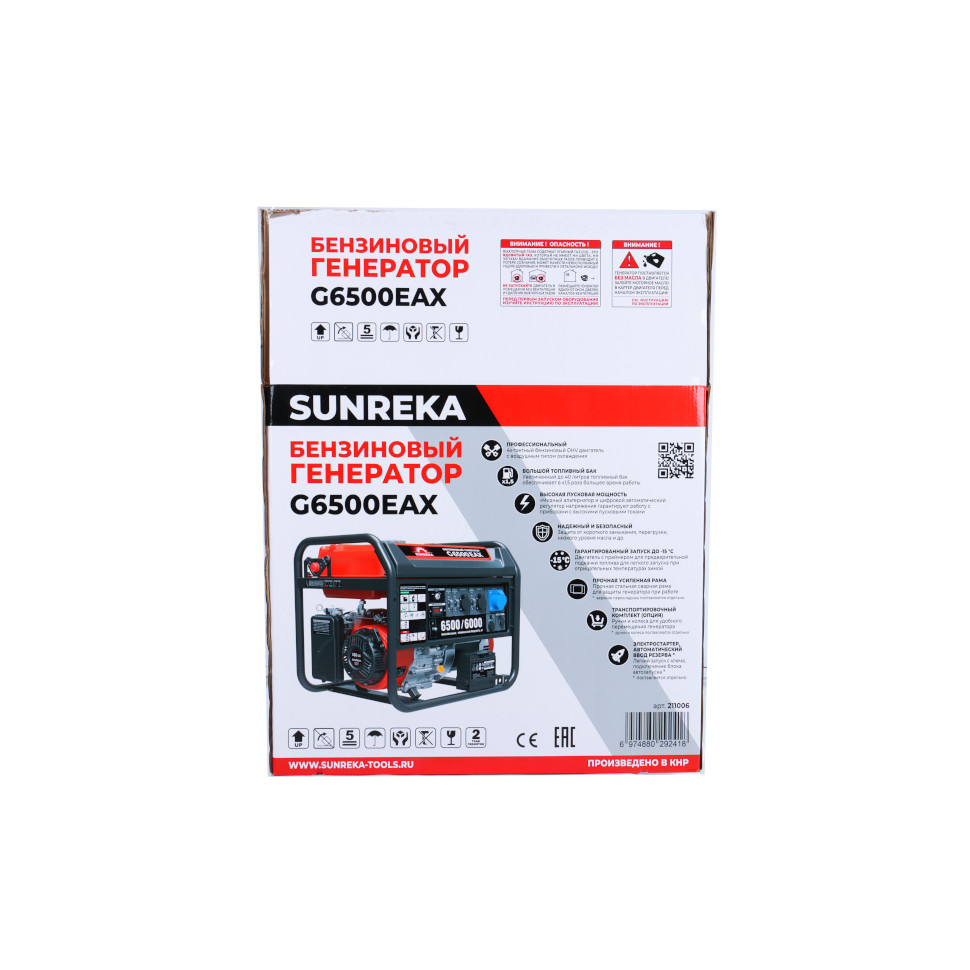 Генератор бензиновый SUNREKA G6500EAX (6,5кВт, 1-Ф, электростартер) 211006. Ключ зажигания. Вилки для розеток. Ножки резиновые. Набор инструментов. Инструкция. Коробка. |