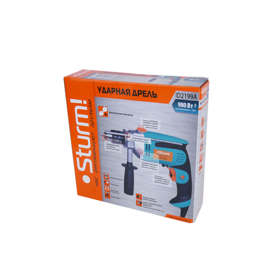 Дрель ударная Sturm ID2199A. Дополнительная рукоятка. Ограничитель глубины сверления. Дополнительные угольные щетки (комплект, 2шт). Ключ. Инструкция по эксплуатации. Коробка. |