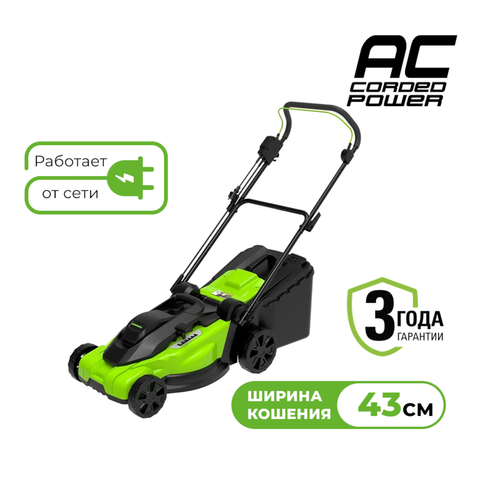Характеристики Газонокосилка электрическая Greenworks LM2000 (2кВт, 43см, 50л) 2515707