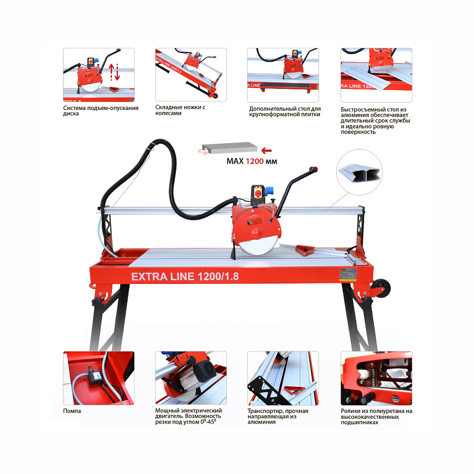 Станок для резки плитки (электрический плиткорез) Diam EX-1200/1.8 отличается мобильностью и совместимостью - складные ножки облегчают транспортировку и хранение станка.
