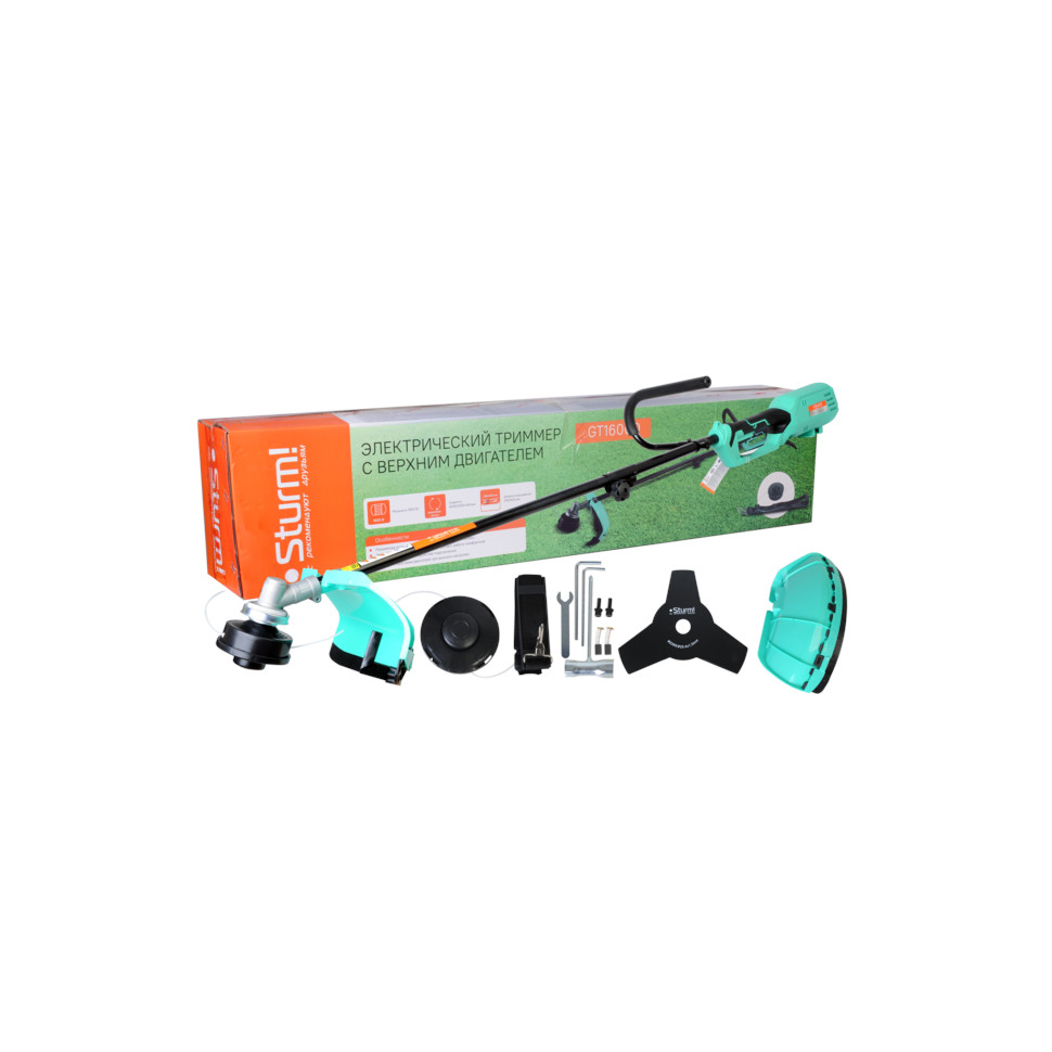 Триммер электрический STURM GT1600D (двигатель с верхней штангой и коннектором). Штанга нижняя с редуктором. Защитный кожух. Рукоятка. Шпулька с леской. Трехлопастной нож. Плечевой ремень. Винт - 2шт. Шестигранный ключ - 2шт. Вилочный ключ. Комбинированный ключ. Дополнительные угольные щетки - комплект, 2шт. Инструкция по эксплуатации. Инструкция по безопасности. Коробка. |
