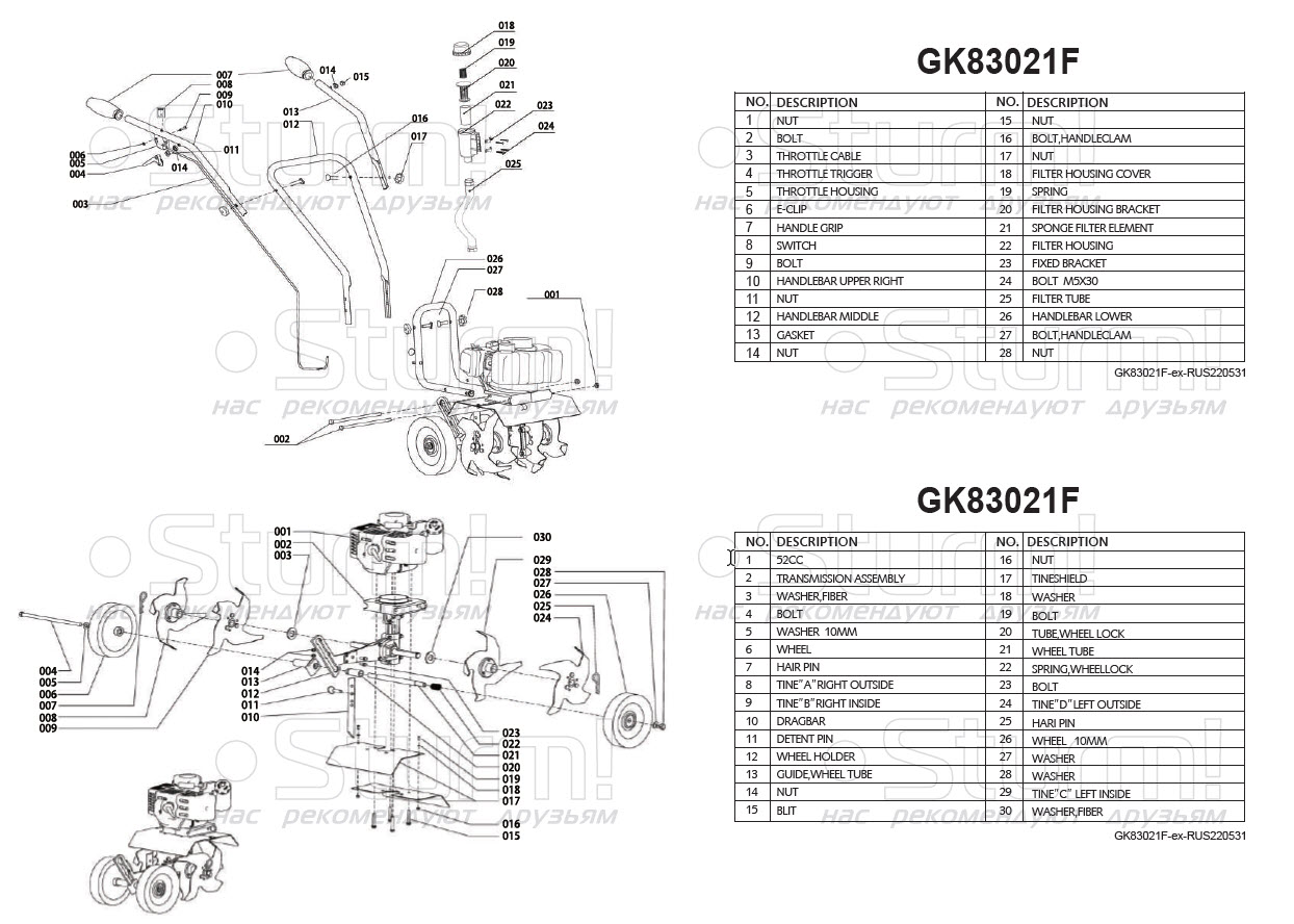 Культиватор бензиновый Sturm GK83021F. Рукоятки. Колеса. Сошник. Емкость для приготовления топливной смеси. Фиксатор рукоятки - 6шт. Держатель тросика - 2шт. Стяжка - 2шт. Шестигранный ключ - 2шт. Гаечный ключ - 2шт. Свечной ключ. Отвертка. Комплект крепежа. Инструкция по эксплуатации и безопасности. Коробка. |