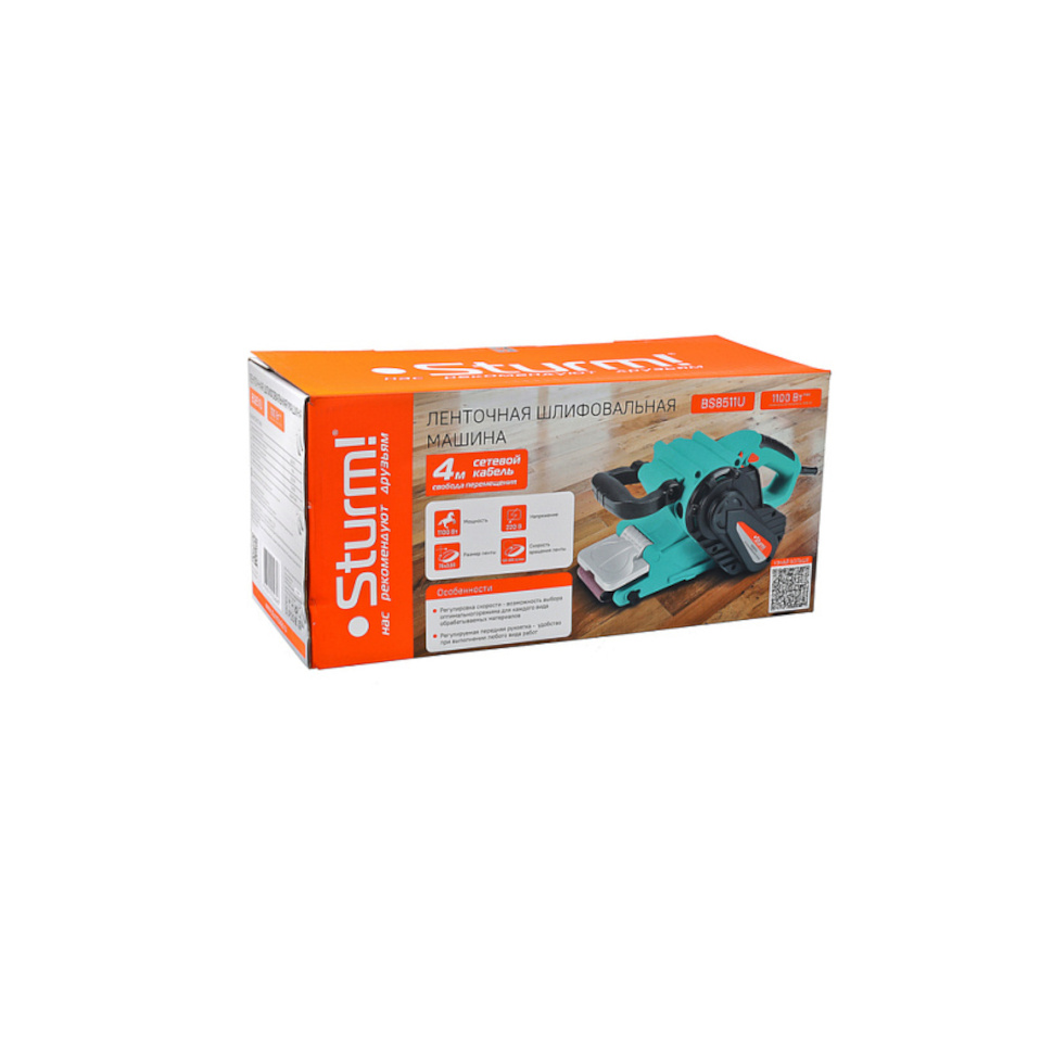 ЛШМ Sturm BS8511U. Шлифовальная лента. Пылесборник. Запасной ремень. Запасная угольная щетка - 1 комплект. Коробка. |