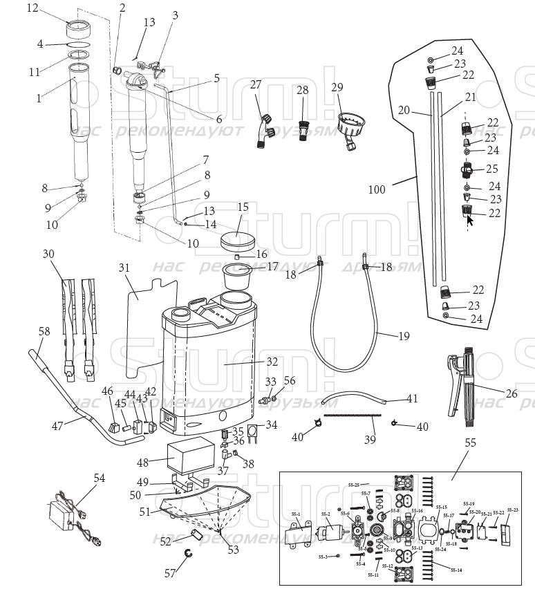 Опрыскиватель садовый аккумуляторный Sturm GS8216BM. Зарядное устройство. Форсунки - 3шт. Уплотнительное кольцо - 4шт. Ручка регулировки расхода. Телескопическая трубка. Кронштейн для трубки. Инструкция по эксплуатации. Инструкция по безопасности. Коробка. |