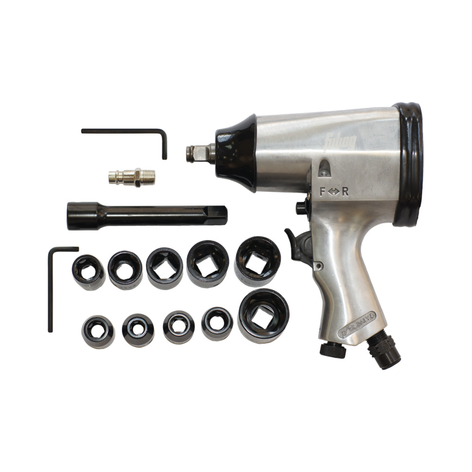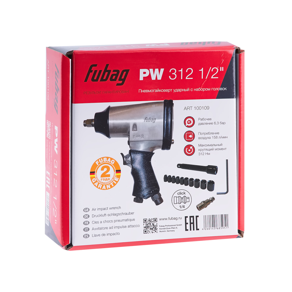 Пневмогайковерт Fubag PW312 + набор головок (100109). 10 головок 1/2". Масленка. Удлинитель 1/2" 125 мм. Шестигранный ключ 4мм. Рапид-штуцер. Кейс. |
