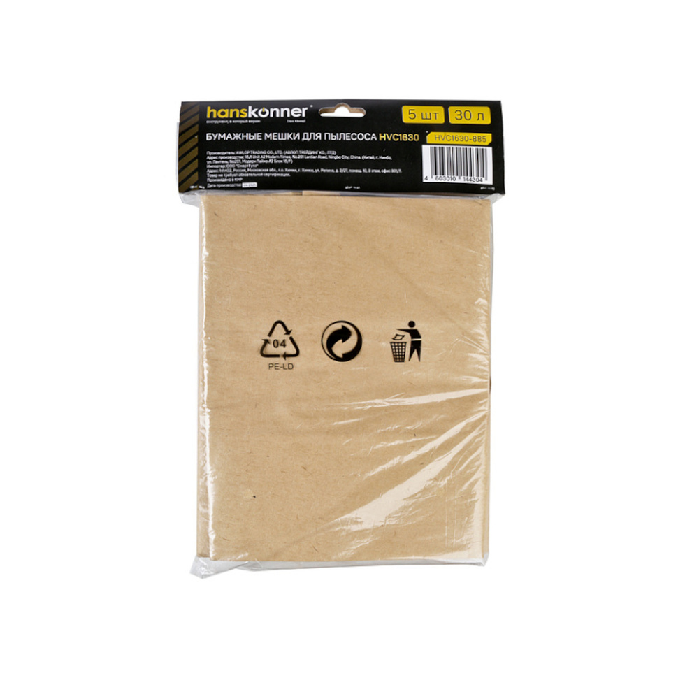 Характеристики Мешок для пылесоса 30л, бумажный, 5шт/уп Hanskonner (HVC1630-885)