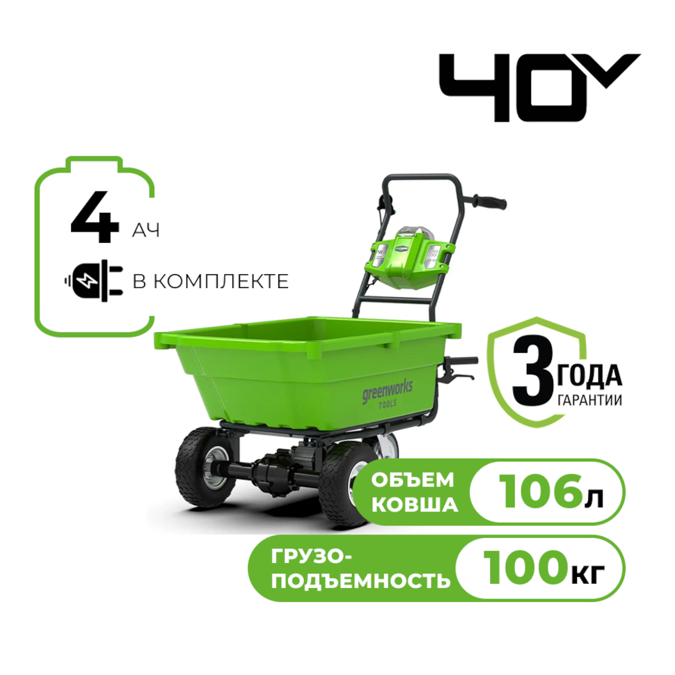 Характеристики Тачка садовая Greenworks G40GC (1хАКБ 4 А/ч и ЗУ) 7400007UB