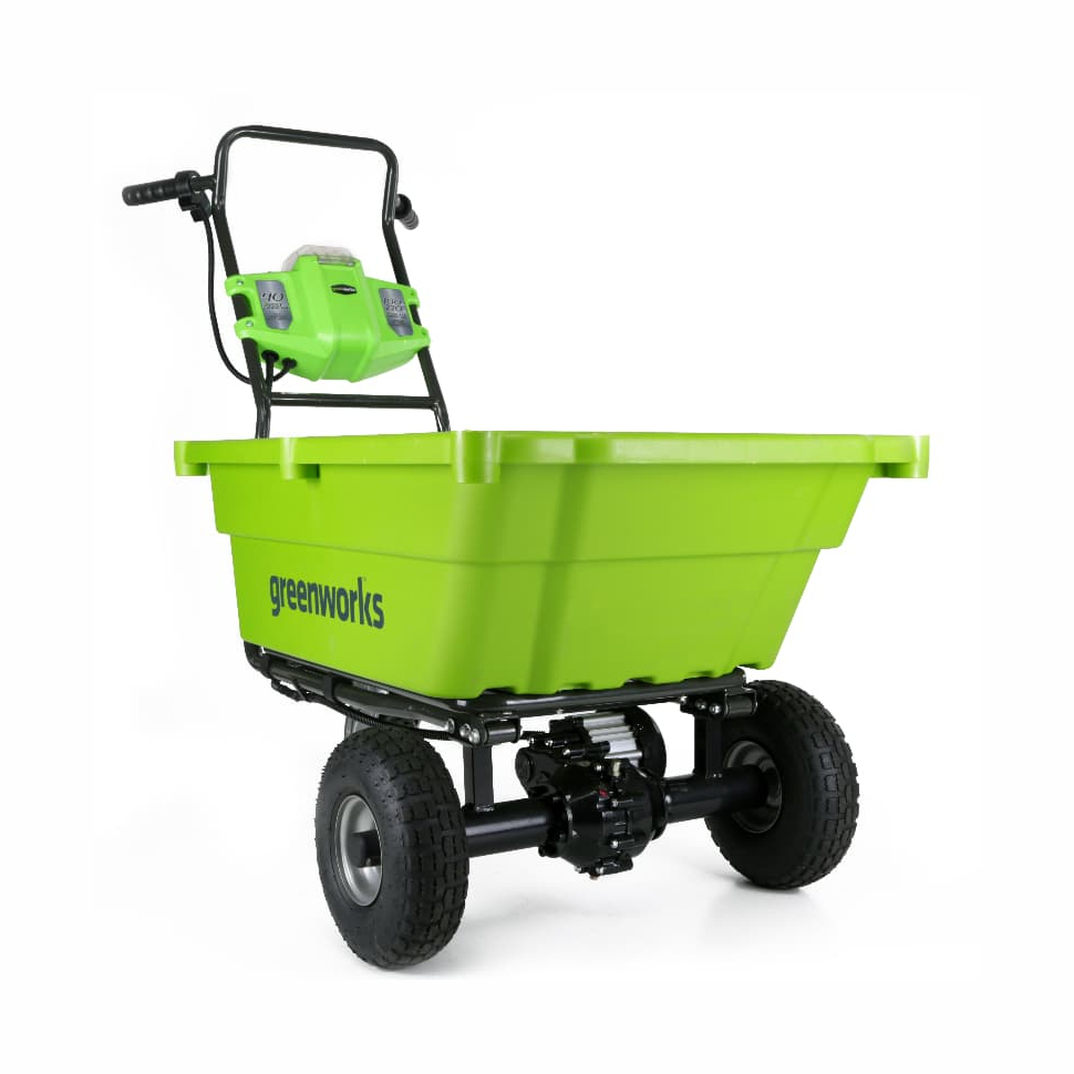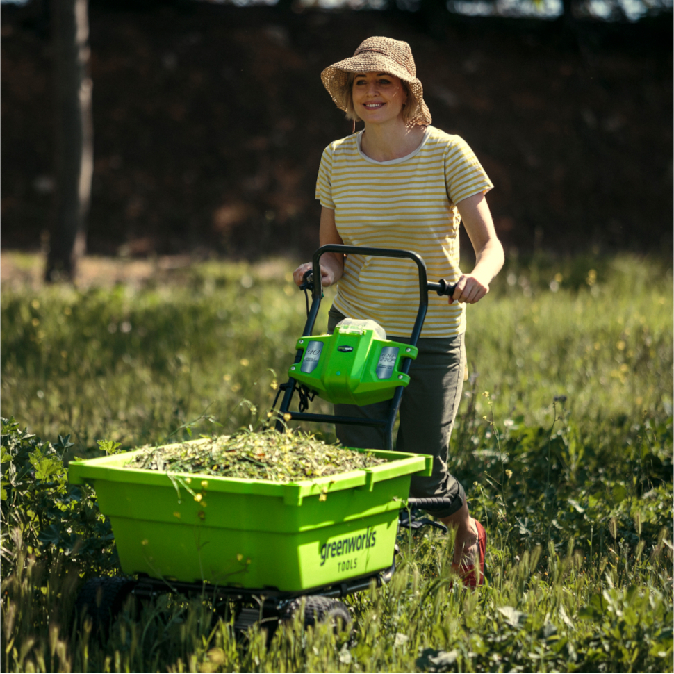 Самоходная аккумуляторная садовая тележка Гринворкс 40V работа от аккумуляторов линейки Greenworks 40V, что обеспечивает экологичность, отсутствие выхлопов и простоту запуска. Тележка легко справляется с перевозкой грузов массой до 100 кг.