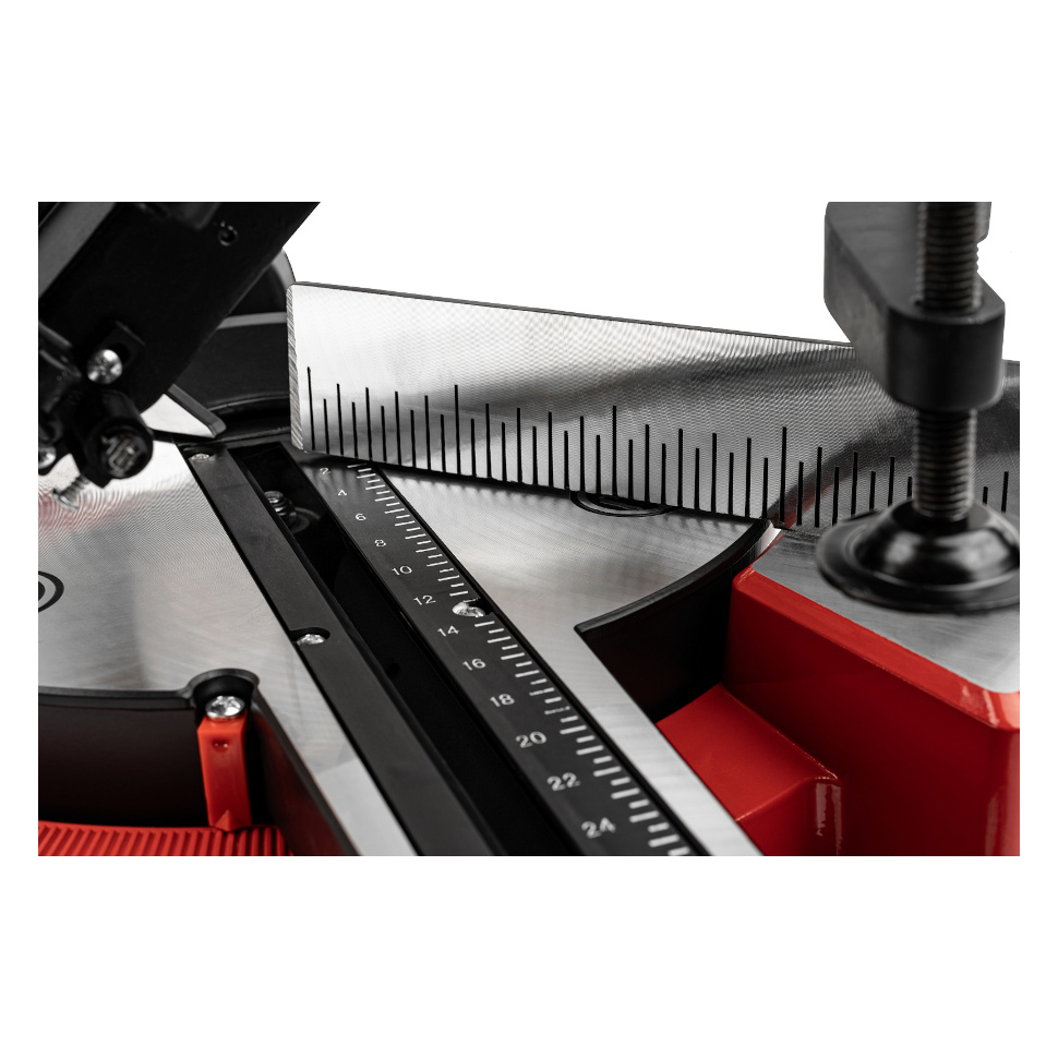 Поворотный опорный стол, имеющий промежуточную фиксацию положений, позволяет производить рез под углом до 45 градусов (влево и вправо).