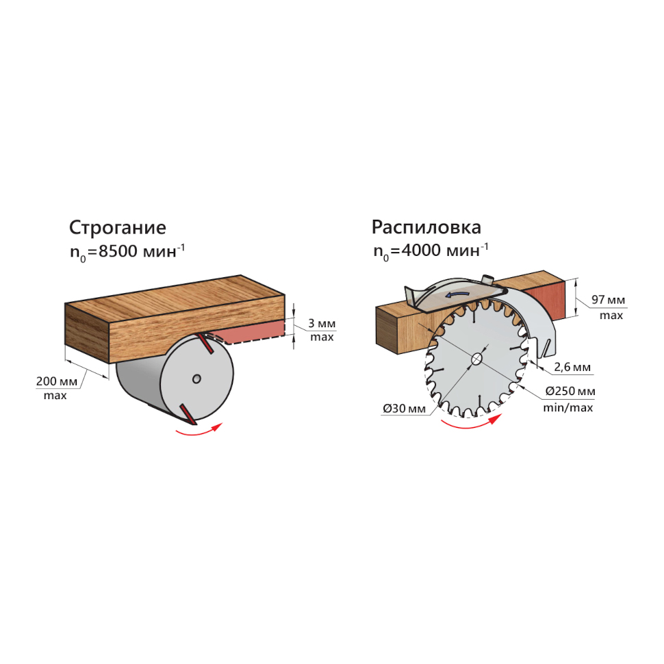 Диапазон углов строгания с помощью параллельного упора от 0 до 45 градусов