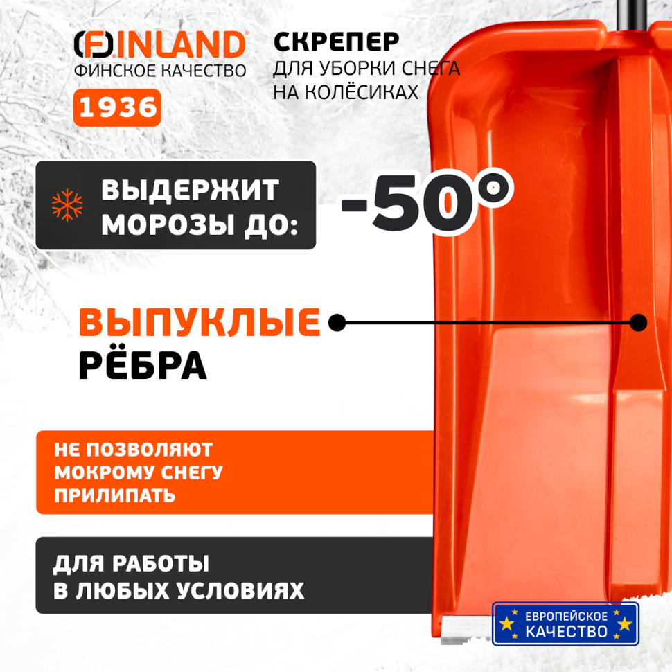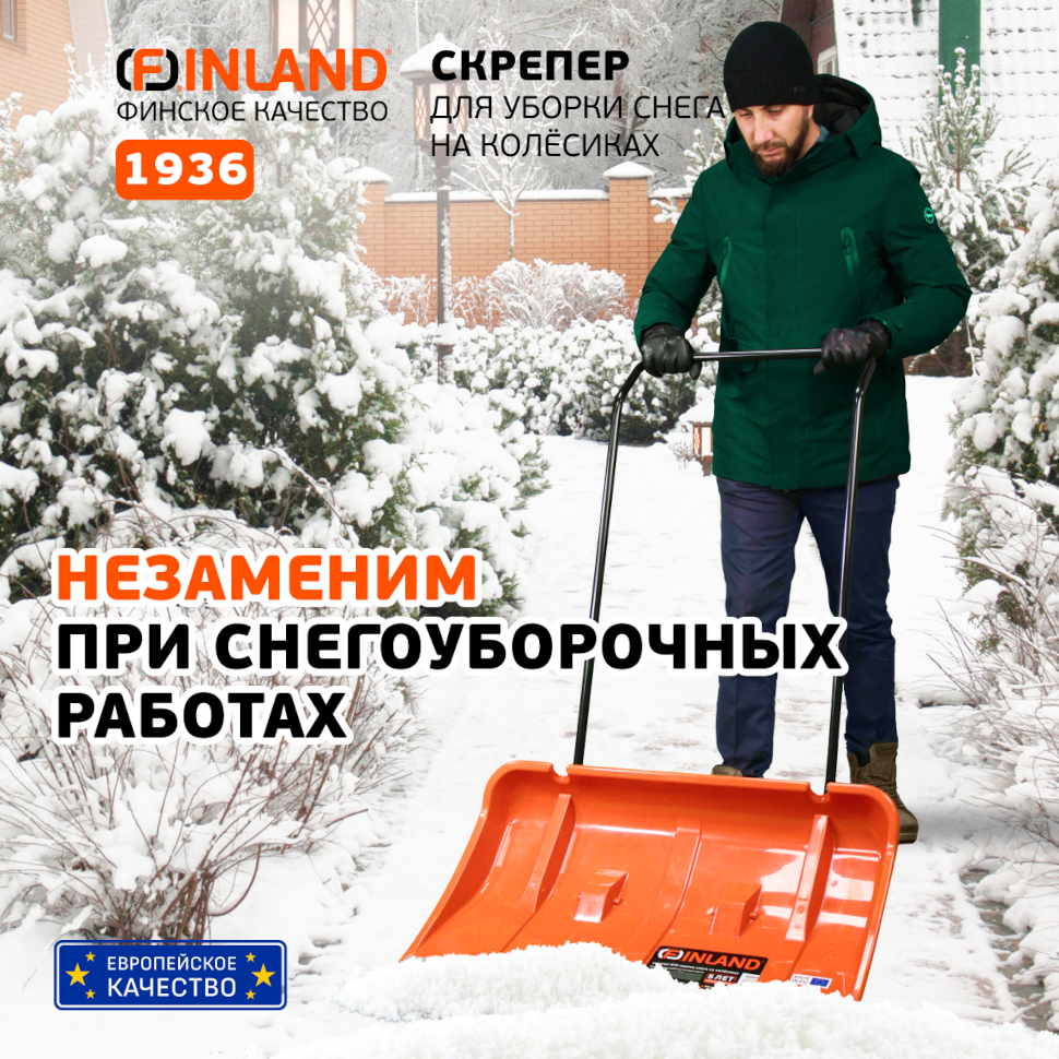 Скрепер для уборки снега на колёсиках Finland (1936) позволяет минимизировать физическую нагрузку на пользователя, позволяя работать в вертикальном положении и регулировать усилие приложения к снежному покрову.
